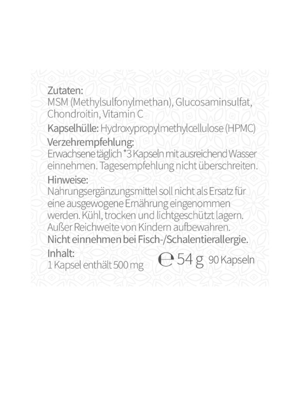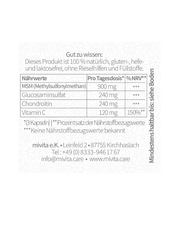 Zutaten: MSM (Methylsulfonylmethan), Glucosamin, Chonodroitinsulfat, Vitamin C